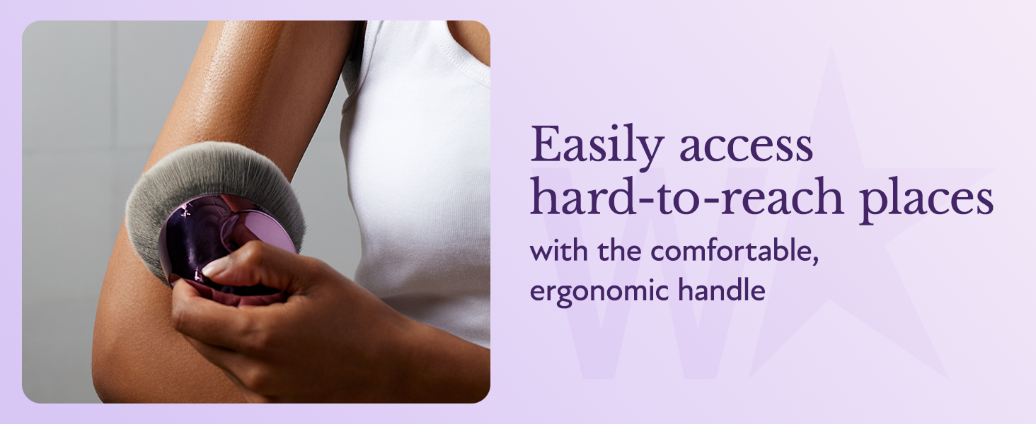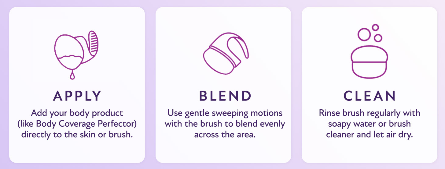 Use with Body Coverage Perfector or your favorite body product. Apply to desired area and with sweeping motions, use the brush to evenly spread and blend product across skin. For best results, wash with soapy water or a brush cleaner after every use. Air dry completely before storing in a cool and clean, dry place.