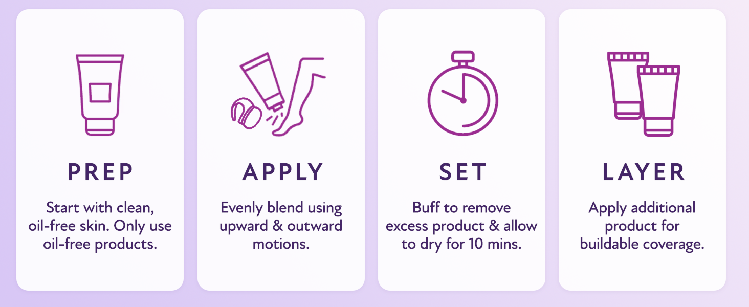 Apply Body Coverage Perfector liberally onto the area you'd like to perfect, using hands or a body brush, blend in an upward and outward motion. Allow the product to dry for 10 mins, and if needed apply additional layers for more coverage allowing each to dry for 10 mins.