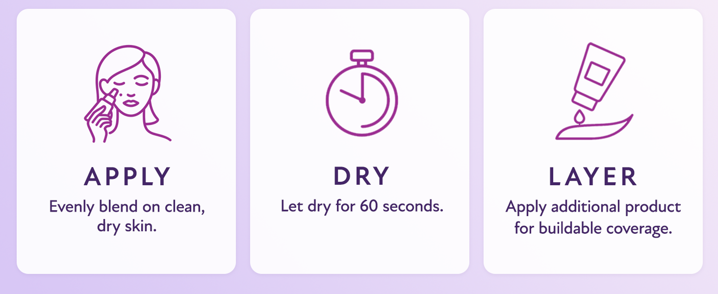 Facial Application: Dot product on forehead, cheeks and chin and gently blend in an upward and outward motion using hands, a foundation brush, or a makeup sponge. For problem areas, apply a small dot where needed, then tap around the edges to blend in. Let dry for 60 seconds, then apply additional layers if more coverage is desired. (See layer guide below for reference)